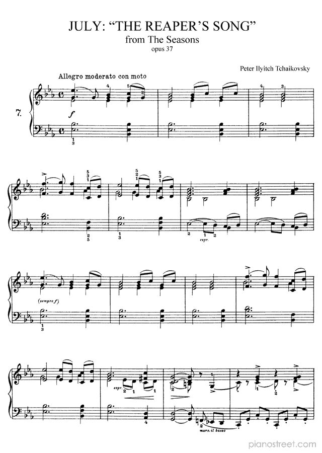 Tchaikovsky: July - The Reaper's Song Op. 37 No. 7 in E-flat Major (published in 1876) . DOWNLOAD piano sheet music from Piano Street digital sheet music library.