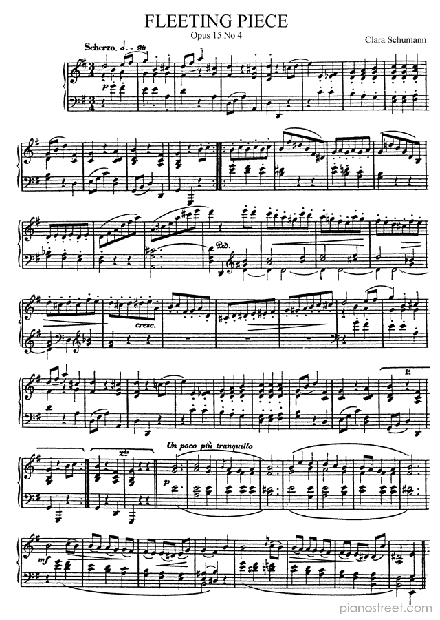 This piece is composed by Clara Wieck-Schumann and was published in 1845. Title: Scherzo, Op. 15 No. 4 in G Major from Four Fugitive Pieces. The difficulty level if graded by ABRSM would be approximately 6 and it belongs to the Early Romantic period.