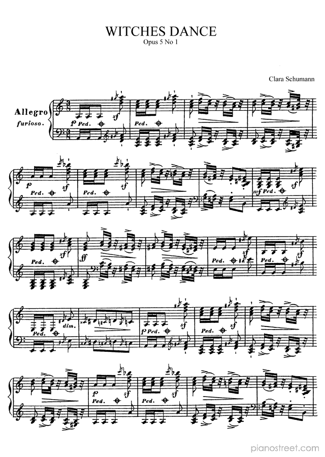 Downloadable piano sheet music by Clara Wieck-Schumann to print: Impromptu, Le Sabbat (Witches Dance) Op. 5 No. 1 in A Minor (published in 1838)