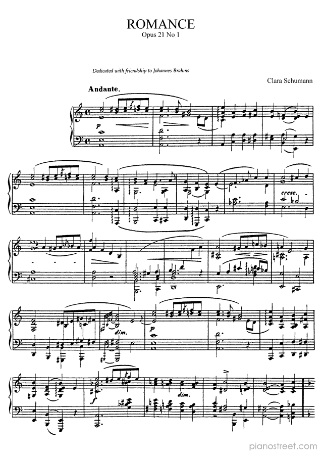 Downloadable piano sheet music by Clara Wieck-Schumann to print: Romance Op. 21 No. 1 in A Minor (published in 1855)